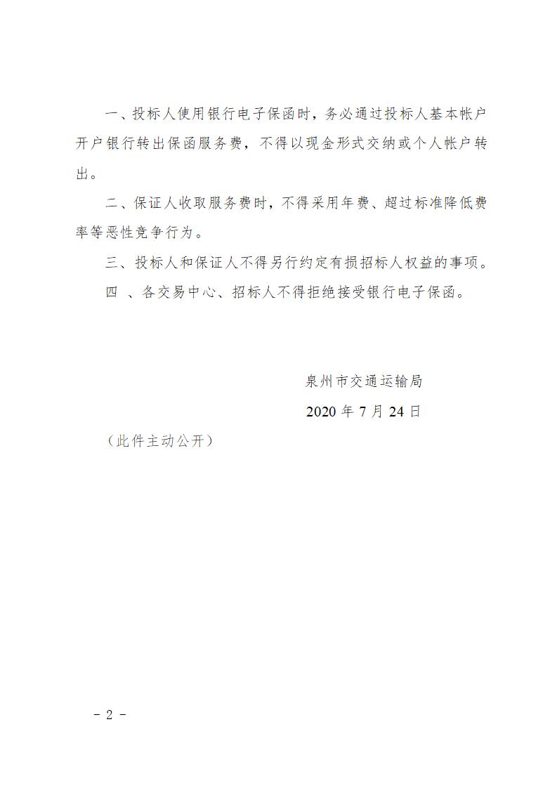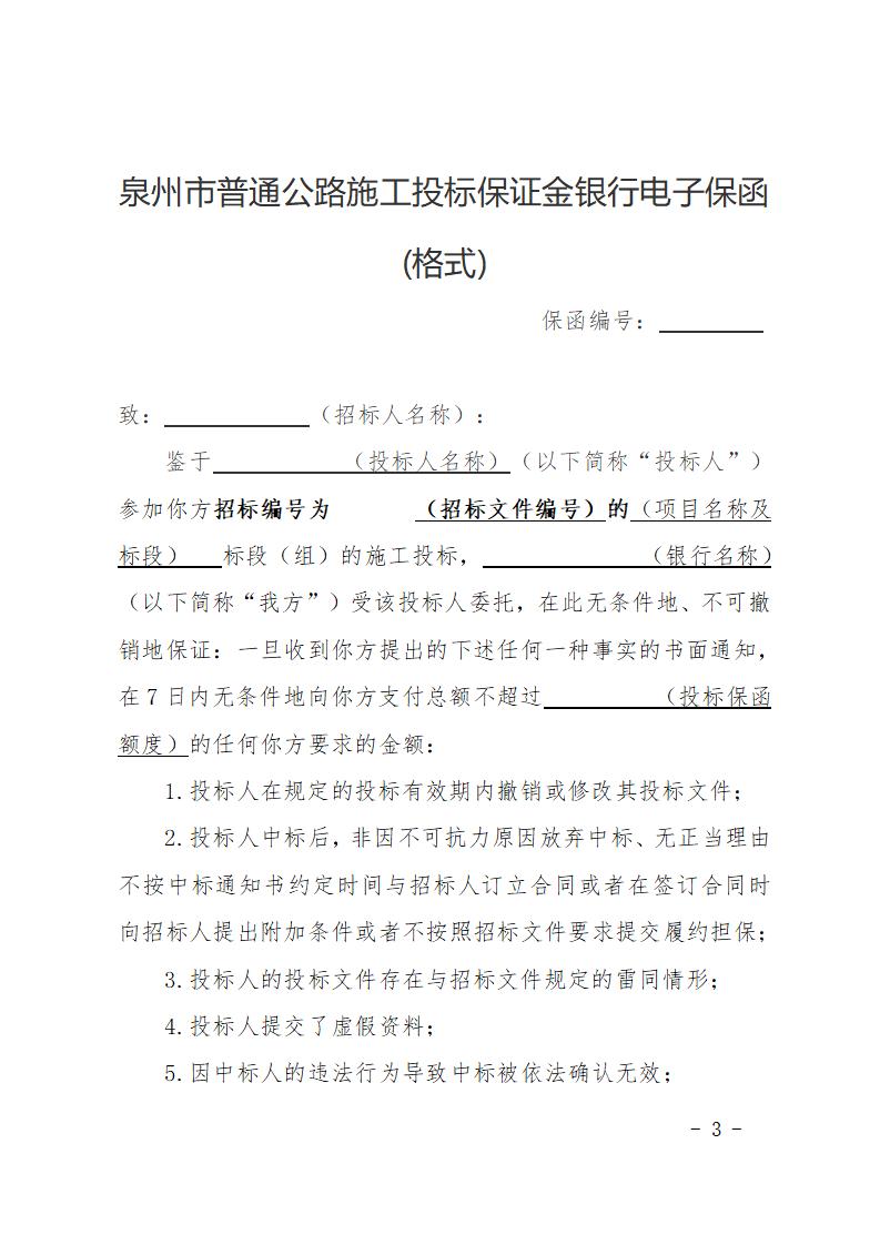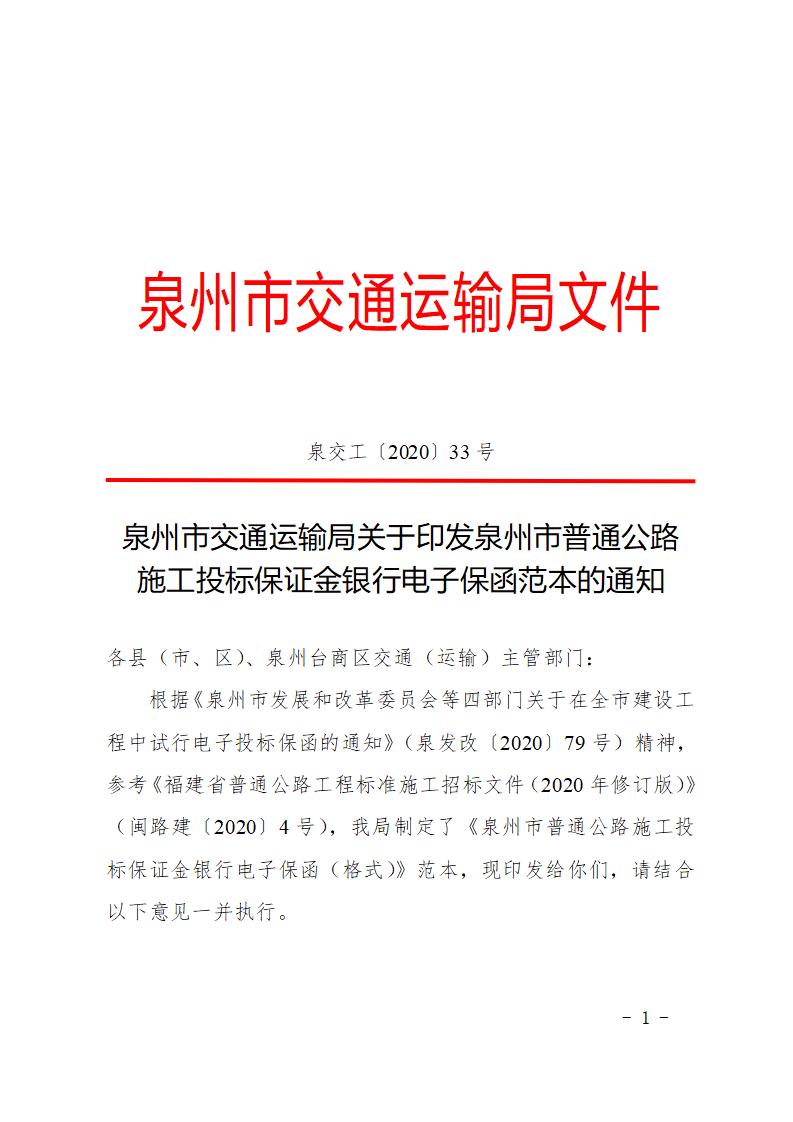 泉州市交通運輸局關于印發(fā)泉州市普通公路施工投標保證金銀行電子保函范本的通知
