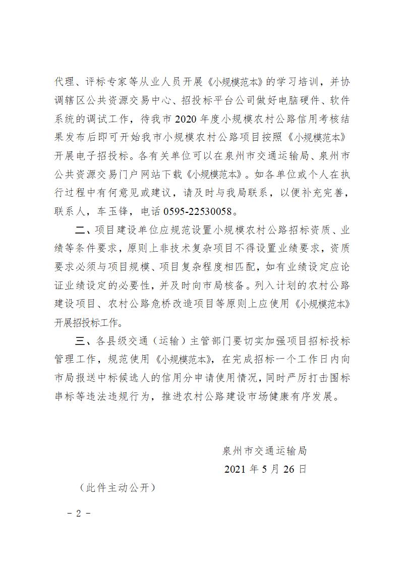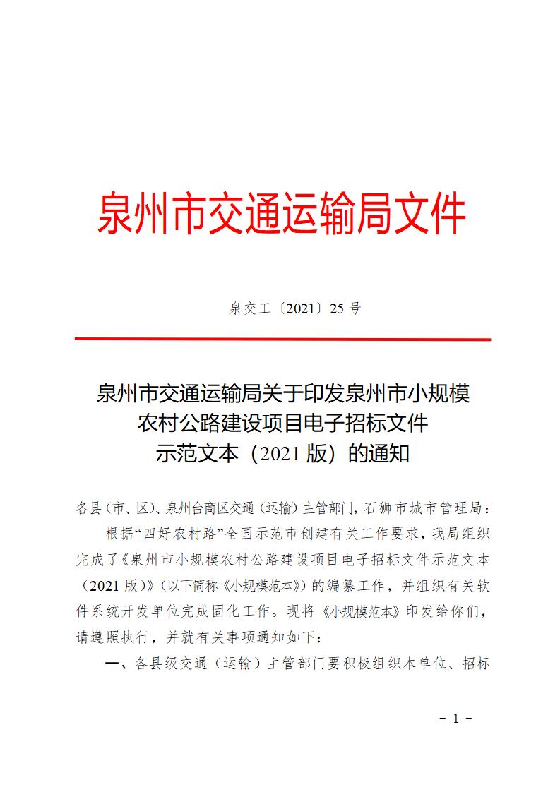 泉州市交通運輸局關(guān)于印發(fā)泉州市小規(guī)模農(nóng)村公路建設(shè)項目電子招標(biāo)文件示范文件(2021版)的通知