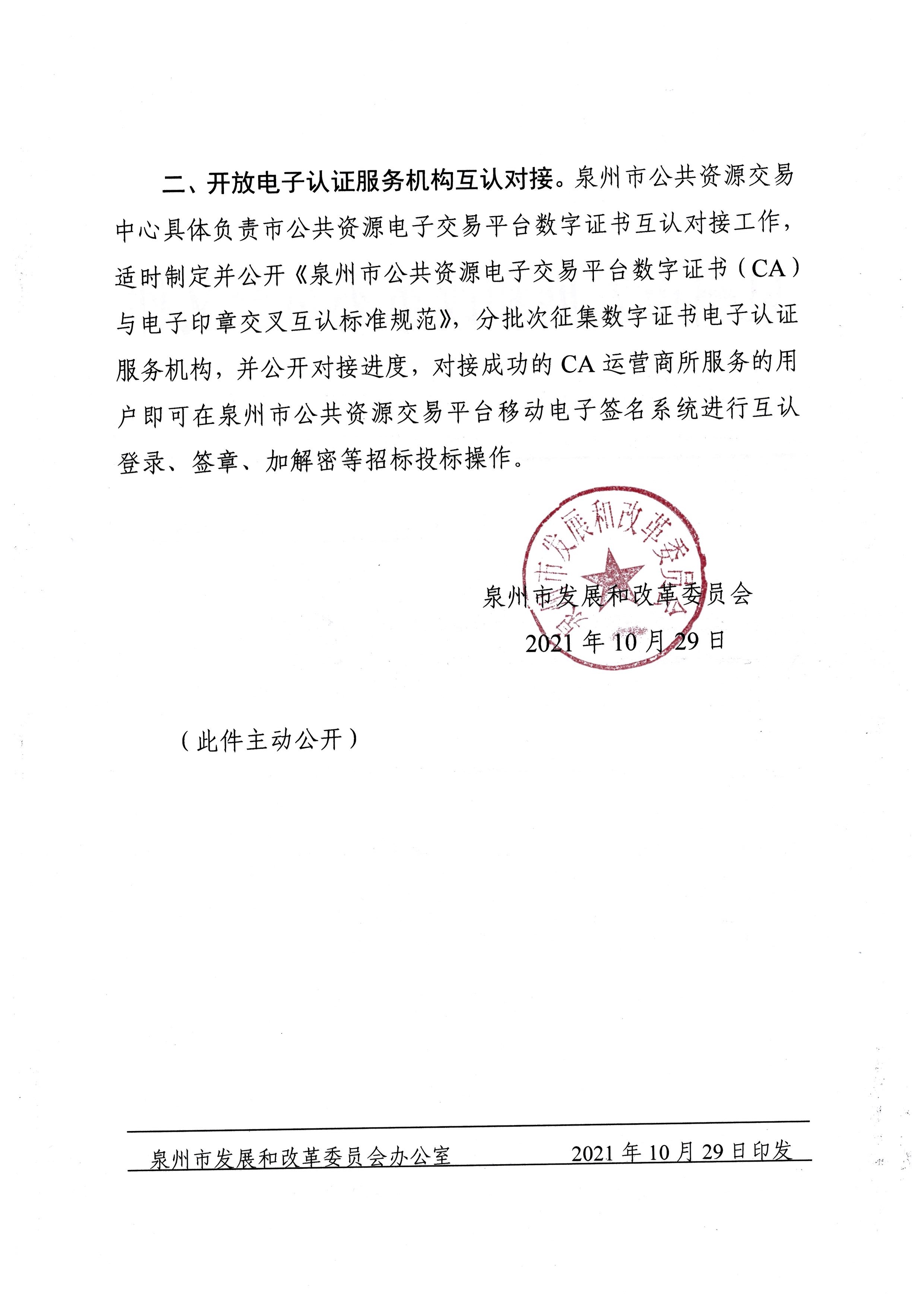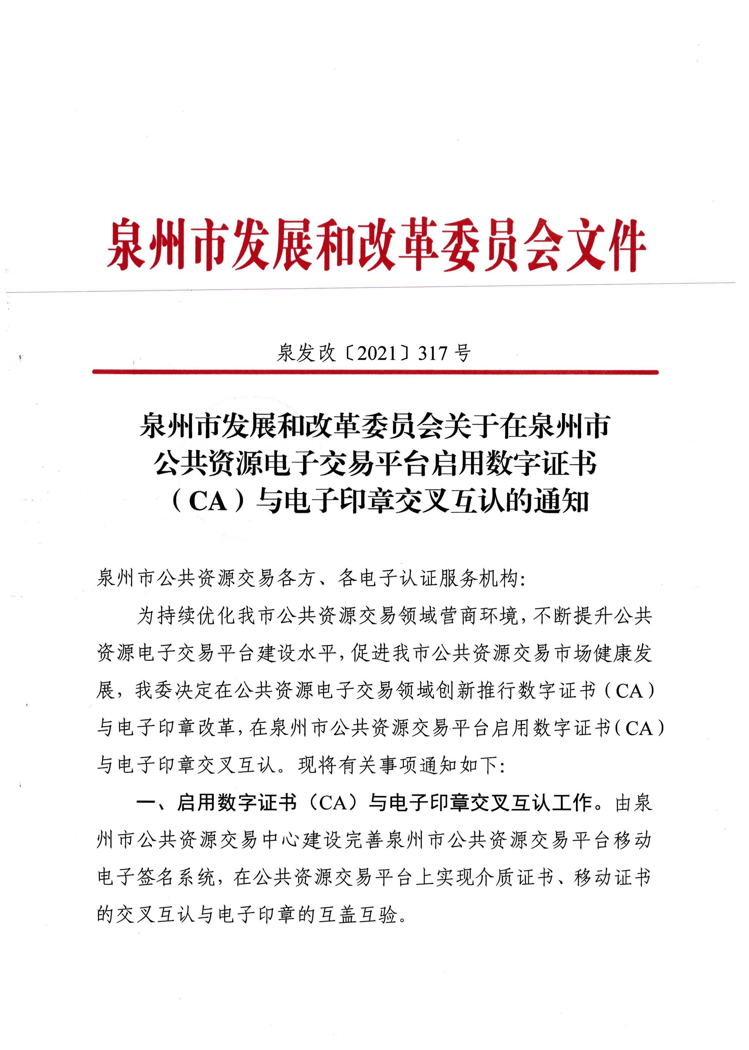 泉州市發(fā)展和改革委員會關(guān)于在泉州市公共資源電子交易平臺啟用數(shù)字證書(CA)與電子印章交叉互認(rèn)的通知